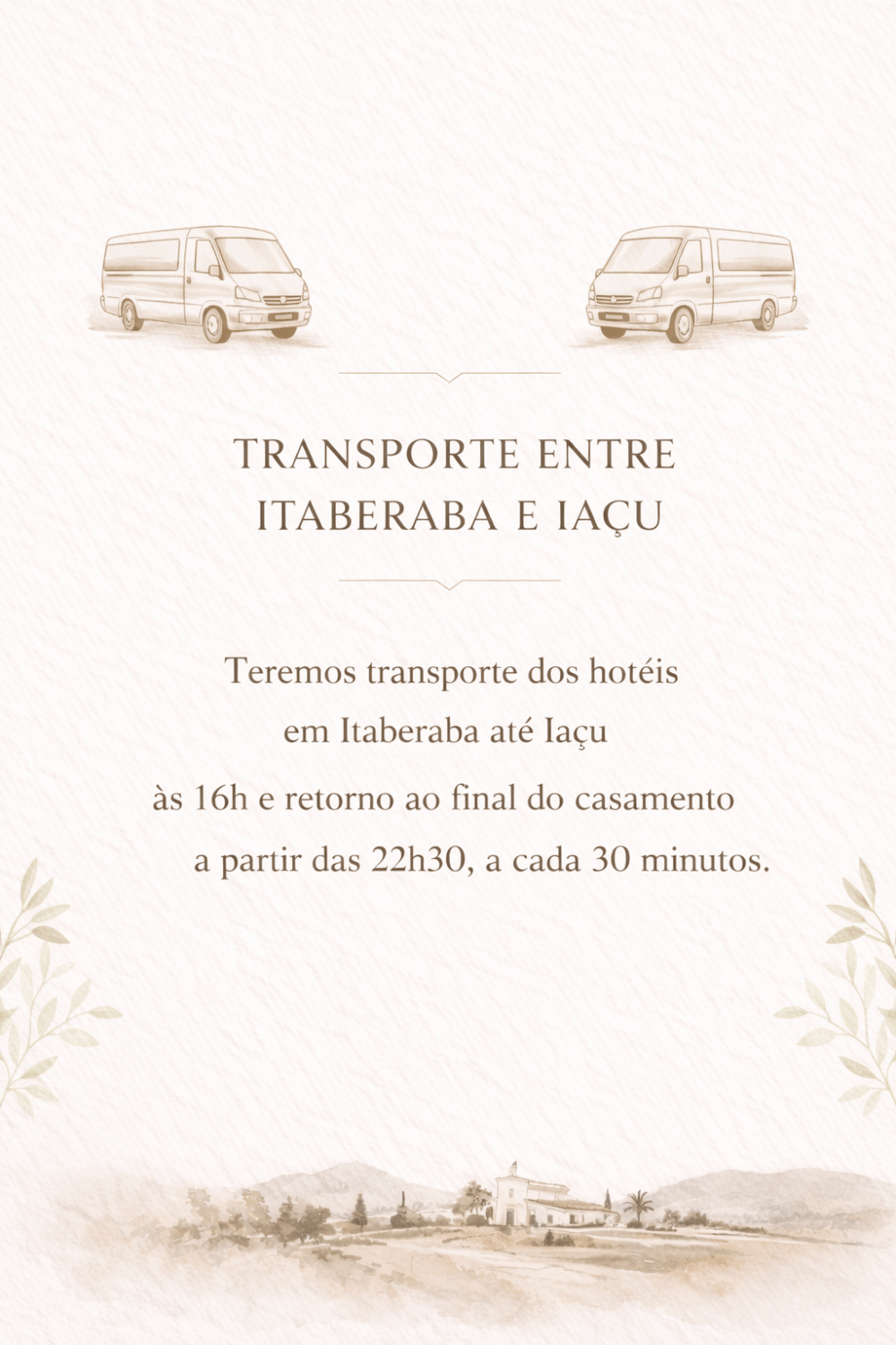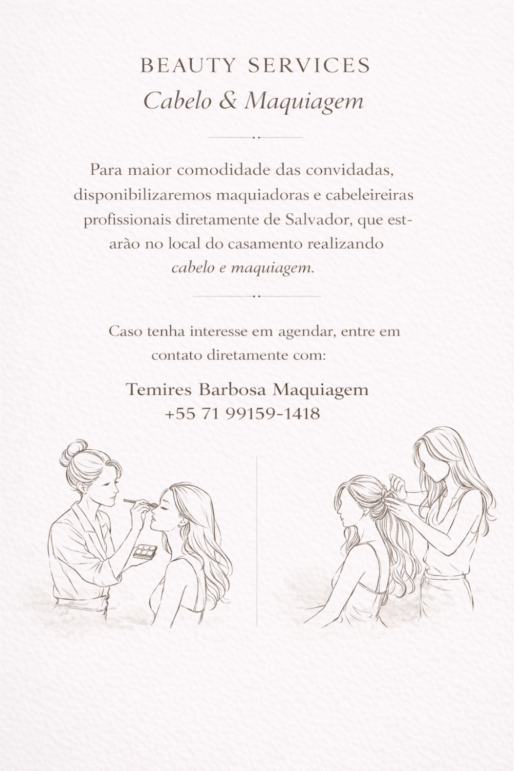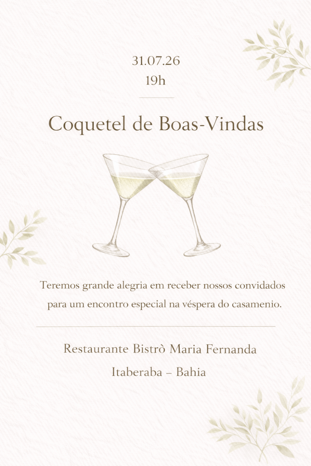 Criamos este espaço para reunir todas as informações sobre o nosso casamento. Cada detalhe foi pensado com carinho para que possamos celebrar esse dia cercados pelas pessoas que mais amamos.